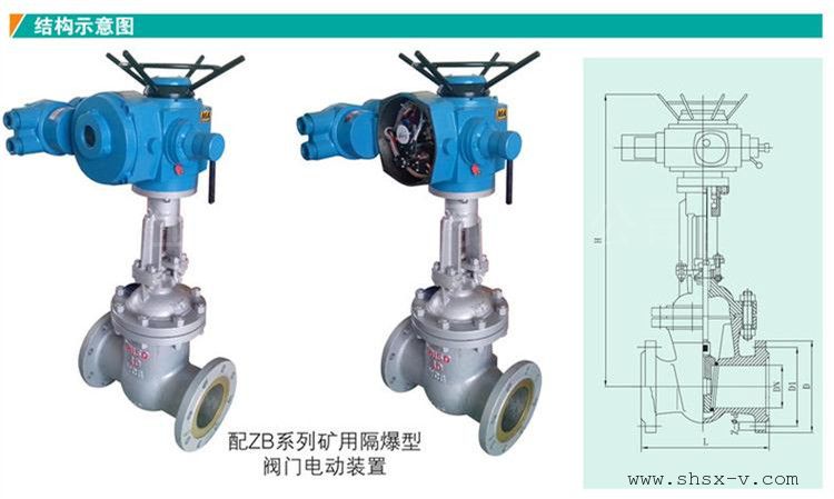 ZB矿用隔爆型电动装置特点:拥有矿用证和煤安证,防爆型防护等级为IP68。适用于易燃易爆的场合,安全系数高、操作功能强、性能稳定等。防爆型产品有dI和dIIBT4两种,dI适用于煤矿非采掘工作面;dIIBT4用于工厂,适用于环境为IIA、IIB级T1~T4组的爆炸性气体混合物。本产品的性能符合JB/T8528-1997<普通型阀门电动装置技术条件>的规定。防爆型的性能符合GB3836.1-2000<爆炸性环境用防爆电气设备通用要求>及JB/T8529-1997<隔爆型阀门电动装置技术条件>的规定。并经国家防爆电气产品测试中心检定,取得了防爆合格证。 整体型电装是在Z普通型基础上派生而成,增加了不少电器和电子元件,整体普通型电气部分主要由多功能模块MK1 远程控制模块MK2 按钮盒指示灯、开度表、接触器等组成。多功能模块MK1又由相位识别器XS、接触器互锁保护器HB和直流电源DC三部分组成。远程模块MK2由四个固态继电器和三个拨码开关组成 。整体调节型电气部分由调节 模块TMK、 防爆矿用电动闸阀,带煤安电动闸阀,防爆矿用电动闸阀,矿用防爆电动闸阀,MZ941H-16C主要用于煤矿,井下,一般这种防爆矿用电动闸阀,带煤安电动闸阀,矿用防爆电动闸阀电源电压有380V和660V,这种电动闸阀必须带有煤安证才能进矿接触器等组成。控制线为220V,50Hz(特殊订货60Hz);远程控制为24VDC。调节模块可接收和输出4~20ma标准信号。电气元件安装在一块可翻转的板上,以便对力矩控制、行程控制器、开度机构进行调整。按钮盒上有三个按钮,中间为现场/远控转换按钮,其左边现场关阀按钮,右边为现场开阀按钮,盖上按钮盒为远方控制,打开盖子为现场操作。2. 矿用电动闸阀,矿用防爆型电动闸阀,MZ941H电动闸阀特点:①阀门采用压力自紧式密封或阀体、阀盖垫片密封结构,值得信赖!使用安全可靠。 ②阀瓣采用双闸板中间带万向顶结构,能自动调整阀瓣与阀座密封面吻合度,保证阀门的密封。同时此结构维修方便,节约费用,阀瓣互换性较好。 ③阀瓣、阀座密封面用钴铬钨硬质合金由等离子喷焊而成,密封面硬度高,耐磨擦,抗擦伤,使用寿命长。 ④阀杆用渗氮钢制成,表面氮化处理,硬度高,抗擦伤,耐腐蚀,使用寿命长。 ⑤电动装置配有转矩控制机构、现场操作机构和手、电动切换机构。除就地操作外,还可以进行远距离操作、PLC控制、4~20mA电流输入输出智能控制等。 ⑥手动阀门由手动机构或撞击时手轮开启。减小阀门操作力。 ⑦阀门可安装在管道的任何位置,同时根据介质和介质的温度选择碳钢或合金钢阀门。⑧初次安装和调试时,必须手动把阀门开到约一半的位置,以免电机相序接反导致阀门或电装损坏。