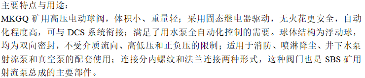 品牌:水兴阀门 型号:MKQ915F-100P-DN32等 结构形式:浮动球直通式 材质:304、316不锈钢等 连接形式:内螺纹 公称通径:DN32 mm 适用介质:水;蒸汽;油品;各种高腐蚀化学介质;弱酸碱介质;氨气;氮气;氧气;氢气;液化气;空气;煤气;含尘气体 压力环境:PN10.0 MPa 工作温度:0~150 ℃ 驱动方式:电动、手动等 流动方向:双向 标准:国标、美标、德标等 零部件及配件:带煤安矿用防爆电动执行器 用途:煤矿井下专用防爆电动球阀 类型:直通式 作用对象:矿井下、煤矿防爆面、冶金、水等 工作电压:常规AC127V 50Hz 控制方式:开关型、调节型、RS-485总线型等 控制信号(输入):开关量信号、模拟量信号等 反馈信号(输出):开关量信号、模拟量信号等 MKQ915F-100P-DN32矿用电动三通球阀 煤安防爆一体式不锈钢球阀 MKQ915F-64P矿用电动三通球阀 煤安防爆一体式内螺纹不锈钢球阀 矿用煤安防爆一体式内螺纹不锈钢球阀 射流阀 排水阀 静压水阀 矿用射流泵总成电动内螺纹球阀 煤安防爆型电动阀门 MGQ911F矿用高压内螺纹不锈钢电动球阀 MKQ911F矿用高压智能一体化电动球阀 隔爆电动阀 MKGQ911F电动阀门 MA带煤安防爆矿用高压电动球阀 MKGQ911F智能一体化电动阀门 矿用一体式电动不锈钢内螺纹球阀 MA煤安防爆 开关型调节型RS-485总线型 矿用一体式电动不锈钢内螺纹球阀 MA煤安防爆 开关型调节型总线型 MKGQ911F矿用电动不锈钢球阀 内螺纹 丝扣连接 1000WOG 2000WOG 矿用高压小口径电动阀 矿用电动球阀 煤矿专用电动球阀 AC127V矿用高压小口径电动球阀 矿用射流阀 矿用射流泵总成电动球阀 矿用喷射泵总成电动球阀 矿用电动排水球阀